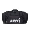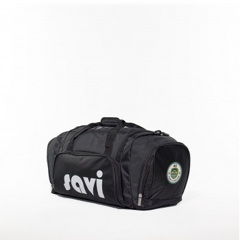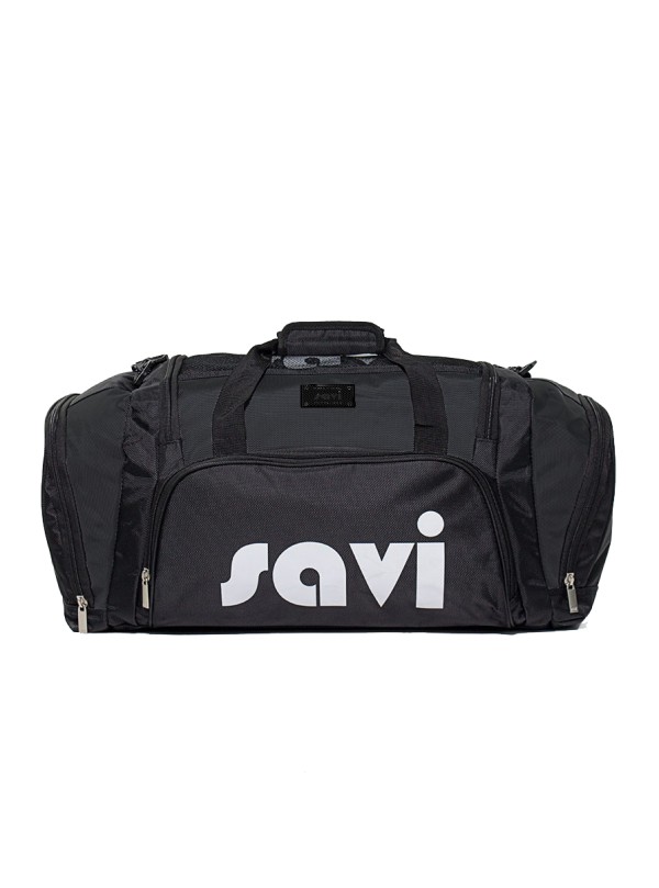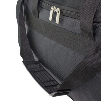 Nylon bag with robust zippers and shoulder strap.